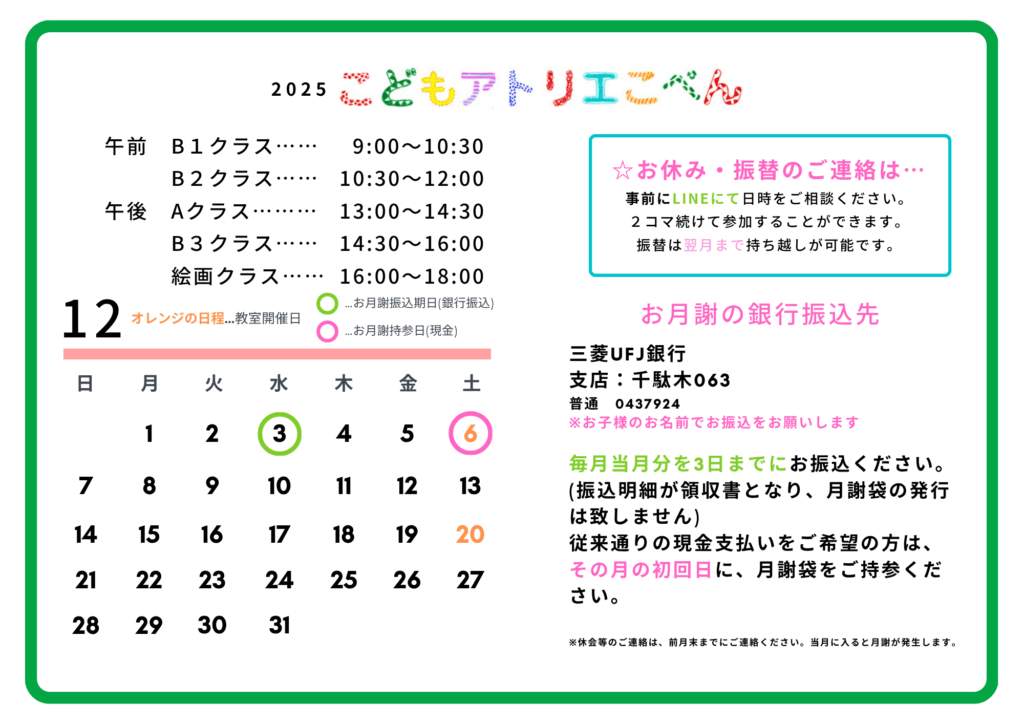 HOME > 【保護者LINEの返答時間について】 平日3日以内に、事務またはななよりご返信致します。 ※アトリエ開講日以外の土曜・日祝はお休みを頂いております。あらかじめご了承ください。 2025年11月9日 author