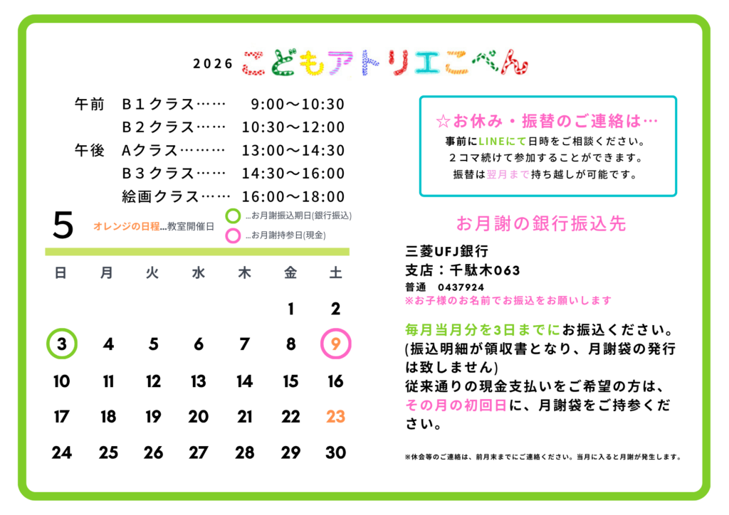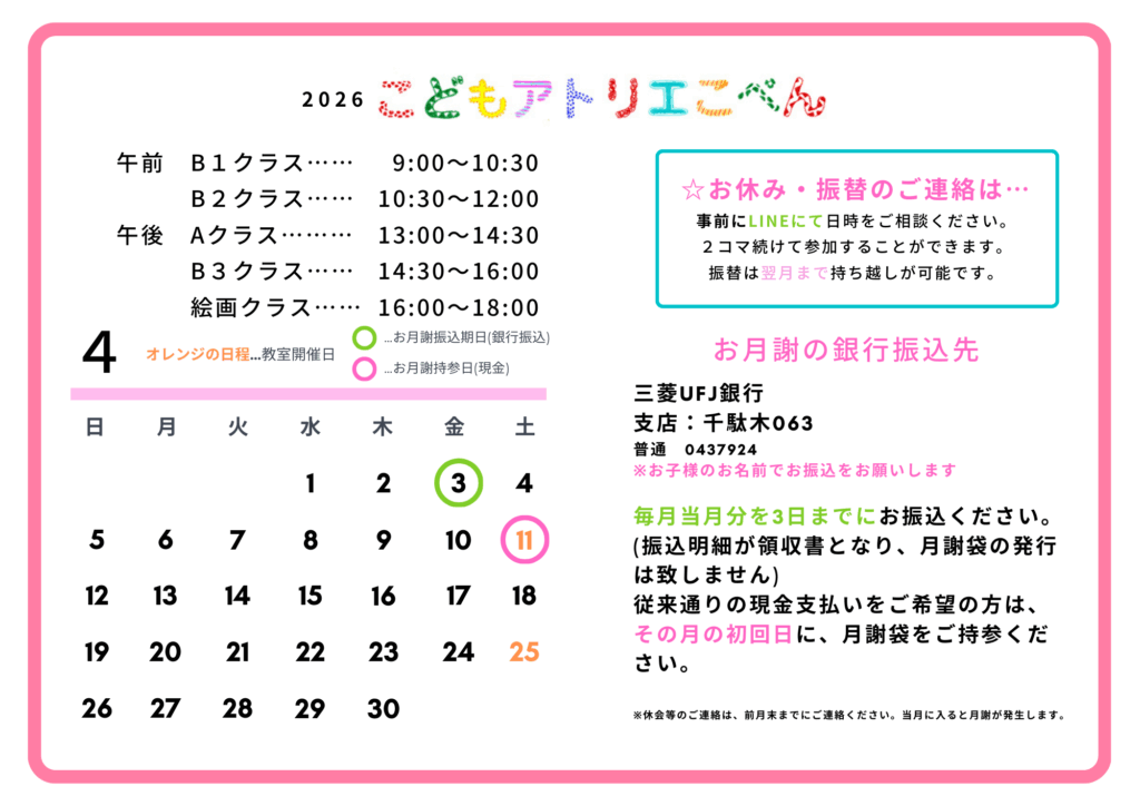 HOME > 【保護者LINEの返答時間について】 平日3日以内に、事務またはななよりご返信致します。 ※アトリエ開講日以外の土曜・日祝はお休みを頂いております。あらかじめご了承ください。 5月は9日と23日で予定表作成中です🙇♀️ 2026年4月3日 author